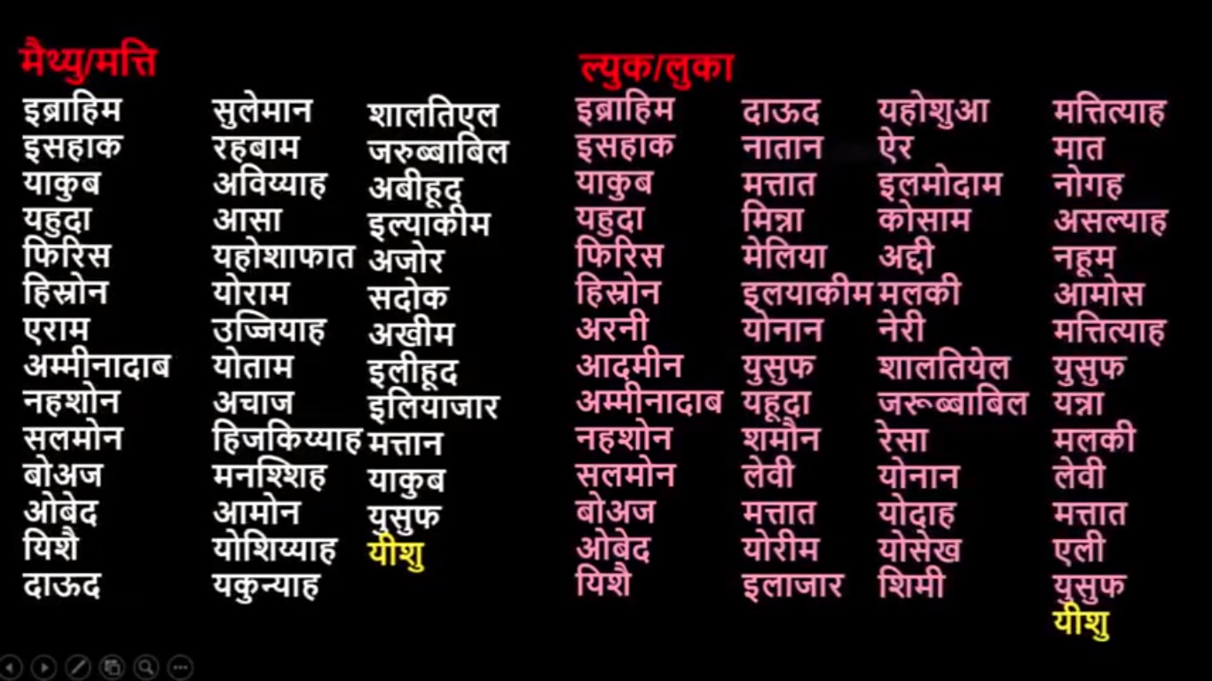 यहां सबसे अहम बात ये है कि मत्ती द्वारा दर्शायी गई वंशावली में यीशु और दाउद के बीच आने वाले कुल 26 नामों में से सिर्फ़ चार नाम ऐसे हैं, जो लूका द्वारा दर्शायी गई वंशावली में भी मिलते हैं.तीन ऐसे हैं जो थोड़े मिलते-जुलते हैं, और जो नाम मिलते (एक समान) भी हैं, उनका क्रम मेल नहीं खाता.