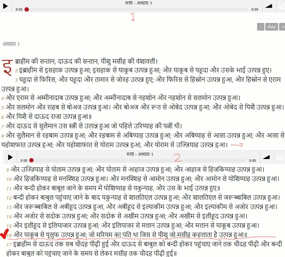 ” याक़ूब से युसूफ पैदा हुआ, जो मरियम का पति था.मरियम से यीशु का जन्म हुआ, जो मसीह कहलाया.”