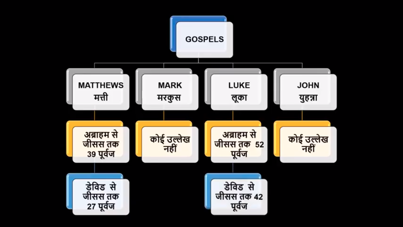 ज्ञात हो कि यीशु के चार शिष्यों में से दो शिष्यों, मरकुस तथा युहन्ना, ने यीशु के पूर्वजों के बारे में कोई ज़िक्र नहीं किया है, जबकि अन्य दो शिष्यों, मत्ती और लूका ने इस पर प्रकाश डाला है.मगर, हैरानी की बात ये है कि दोनों की ओर दी गई वंशावली के वर्णन एक दुसरे से मेल नहीं खाते, दोनों में बहुत फ़र्क है.