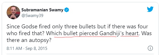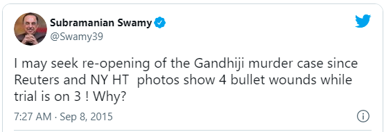 गांधी के शरीर पर लगी गोलियों के बारे में सुब्रह्मण्यम स्वामी का ट्वीट