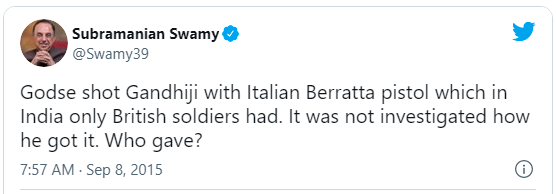 सुब्रह्मण्यम स्वामी ने कहा है कि पुलिस द्वारा नाथूराम गोडसे से बरामद की गई पिस्तौल दरअसल, एम-34 बरेटा इतालवी (इटली में बनी) पिस्तौल थी.यह उस वक़्त भारत में सिर्फ़ ब्रिटिश सैनिकों के पास होती थी.