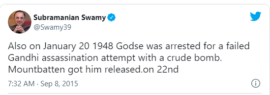 गांधी को गोडसे द्वारा तथाकथित बम से मारने की कोशिश को लेकर सुब्रह्मण्यम स्वामी का ट्वीट